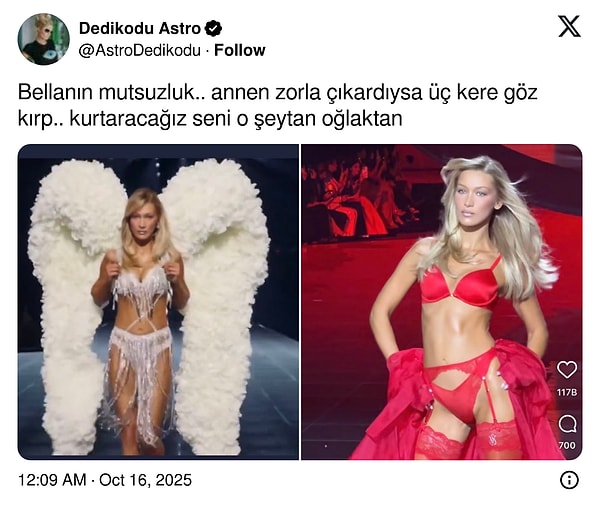 2025 Victoria’s Secret Moda Şovu sosyal medyada sadece mankenlerin güzellikleriyle değil, kullanıcıların esprili yorumlarıyla da konuşuldu. Özellikle Bella Hadid’in 23 kilo ağırlığında kanatlarla podyuma çıkması ve Gigi Hadid’in kanatlarının “yorgana” benzetilmesi, X kullanıcılarının mizah yeteneklerini konuşturmasına neden oldu.