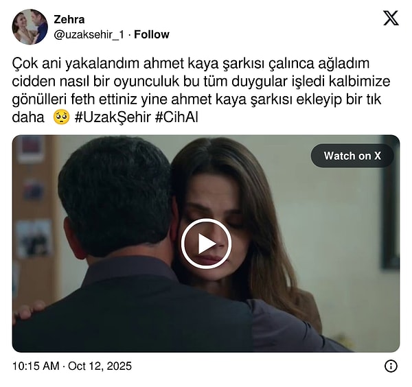 Kanal D’nin reyting rekortmeni dizisi Uzak Şehir, yeni fragmanıyla yine gündemi salladı! 33. bölümün 3. tanıtımında Ahmet Kaya detayı izleyicileri duygulandırdı. Ünlü sanatçının “Şiire Gazele” şarkısının kullanıldığı sahneler sosyal medyada fırtına estirdi. Fragman kısa sürede binlerce izlenmeye ulaştı, izleyiciler “Tüylerimiz diken diken oldu!” yorumlarıyla beğenilerini dile getirdi.