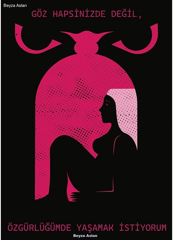 Tasarımın izleyici üzerinde etki bırakma gücünü, görünmeyeni görünür kılmak ve bildiğimiz şeylere başka bir açıdan bakmamız sağlamak olarak algılıyorum. Tasarımın en güçlü yanı bence; karmaşık görünen düşünce veya duyguları tek bir görüntüyle, sembolle, tipografiyle hissettirebilmesi. Oldukça basit görünen bir iş bile üzerine düşündükçe farklı anlamlar barındırmaktadır. Benim için tasarım hem kişisel hem de toplumsal hikâyeleri yeniden yorumlayarak bir etki alanı yaratma çabası. İzleyiciyle kurulan bu görünmez bağ, yaptığım işin değerini ve amacını belirleyen en önemli şey. Toplumsal ve kişisel konuları ele alırken ortaya bir problem sunuyorum. “Böyle bir sorunumuz var, bunu çözebilecek nasıl bir proje yapabilirim?” Bu soruya bulduğum cevap ile projemi geliştiriyorum. Bana en çok ilham veren aslında sadece bir tane projem yok, fakat seçmek gerekirse bunu iki projeye düşürebilirim. Birincisi, hayvan sömürüsü üzerine yapmış olduğum pop-up kitabıdır. Her bir sayfasında farklı hayvan sömürülerine değinmiş olup, etkili illüstrasyonlar ve pop-up mekanizmaları ile vermek istediğim mesajı desteklemiş bulunmuştum. Bir diğer çalışmam ise, “Kırılma Noktası” isimli sergi için hazırlamış olduğum “Göz Hapsi” isimli afiş çalışmamdır. Bu afiş çalışmamda toplumun kadınların üzerinde olan baskıcı ve yargılayıcı bakışlarını ele aldım. Tepeden bakan gözler toplumun baskısını yansıtırken kadın bu baskı ile kendisini sıkışıp kalmış hissetmektedir, bu sıkışmışlığın içinde gerçek potansiyelini bulamamanın hüznü de vardır.