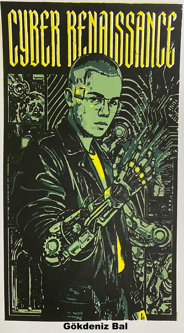 Benim için dijital dünya, fiziksel dünyadan kopuş değil, onun yeni bir katmanıdır. Öncelikle Cyber Renaissance bir proje ismi değil o serinin ismi Sentetik Evrim bu projede izlediğim yöntem dijitalin sunduğu sınırsız imkanlarla kusursuz bir görüntü tasarlarım. Ardından bu görüntüyü renklerine indirgeyip (color reduction) katmanlarına ayırarak baskıya hazır hale getiririm. Ancak benim için sanat, bu dijital dosya değil; o dosyanın kağıtla buluştuğu andır. Dijitalde hazırladığım kusursuz eskizi geleneksel baskı teknikleri ile kağıda aktararak günümüzdeki teknolojinin baskı sanatçıları için önemli bir takip ve yardımcı bir aracı olduğunu vurgulamaktır. Gelecekteki oyun stüdyosu vizyonumda da dijital çizimlerimi baskı yoluyla fiziksel gerçekliğe taşıyorsam, ileride tasarlayacağım oyunlarda da genel olarak sanatın bana katmış olduğu estetik tecrübeler ve kaygıyı dijital evrene taşıyarak iki dünya arasında bir köprü kurmayı düşünüyorum.