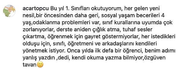 Birkaç yıl aynı yaş grubuna ders verdiğini söyleyen öğretmen, yeni neslin konuyu anlamakta çok güçlük çektiğini anlattı. Genel gözlemler ve araştırmalar, yeni neslin dikkatinin daha kolay dağıldığını gösteriyor. Bunda teknoloji ve yaşam tarzı etkisi büyük. Akıllı telefonlar, sosyal medya ve hızlı bilgi akışı, çocukların ve gençlerin uzun süre tek bir şeye odaklanmasını zorlaştırabiliyor. Bunun yanında sağlıksız beslenme de zihinsel gelişimi etkileyebiliyor. Peki siz öğretmenin tespitine katılıyor musunuz?