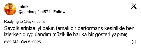 Pandomim gösterileri, hiç söz olmadan taşıdıkları derin anlamlarla seyirciyi zaten büyülüyor. Yarışmacınının gösterisi de pek çok kişinin kalbine dokundu. Gösterinin sözleri olmadığından herkes gösteriden kendince bir anlam çıkardı.