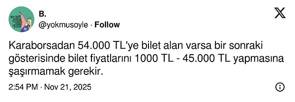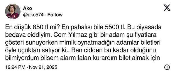 Gösteri için biletler normal kategorilerde 850 TL ile 5.500 TL arasında, VIP bölümde ise 10.000 TL’ye kadar alıcı bulurken; biletler tükendikten sonra karaborsada 54.000 TL’ye varan fiyatlara çıkması gündem oldu.
