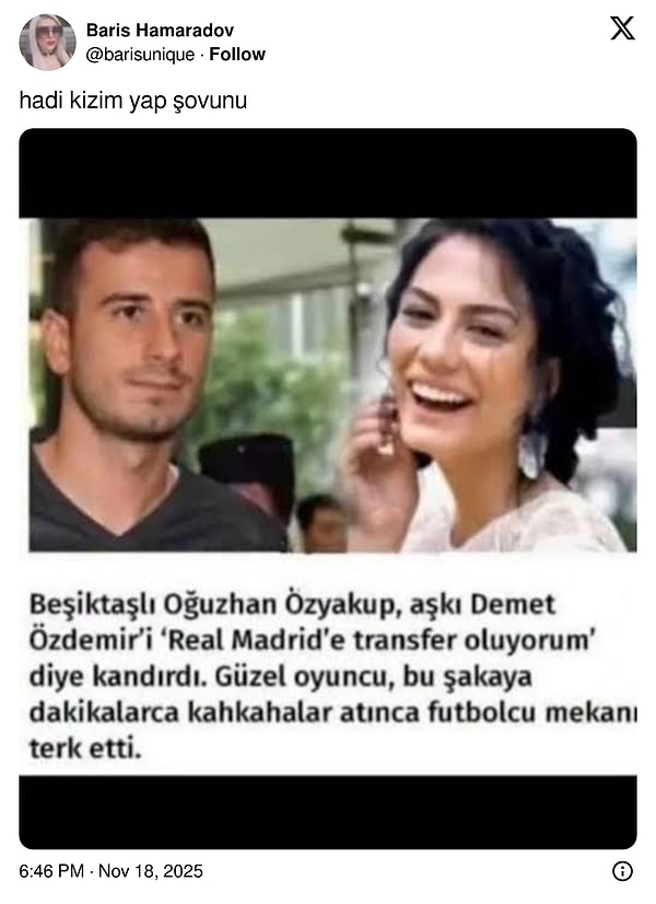 Takvimleri biraz geriye sarınca, bu kez karşımıza Beşiktaş’ın eski yıldızı Oğuzhan Özyakup çıkıyor. 2017 yazında ikilinin Bodrum/Gümüşlük tarafında aynı evde görüntülendiği ve kısa süreli bir ilişki yaşadıkları magazin kulislerinde sıkça konuşulmuştu. Haberlerde, bu ilişkinin çok uzun sürmediği, ayrılık sonrası Oğuzhan’ın Demet’i arayıp barışmak istediği, Demet’in ise bu ısrardan rahatsız olduğu iddia edilmişti.