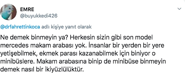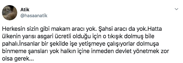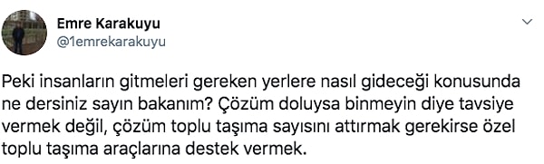 Peki dolu olduğu için dolmuşa binmeyip işine geç kalan çalışanın arkasında kim duracak? Bakanın bu gerçeklikten uzak tavsiyesi hakkında sizin düşünceleriniz neler?