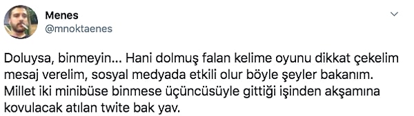 Şimdi de Fahrettin Koca Twitter hesabından bir dolmuş fotoğrafı paylaşarak "Doluysa binmeyin" tavsiyesi verdi. Haliyle bu paylaşım da eleştirilerine neden oldu.