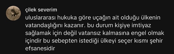 Uçakta doğmakla ilgili birçok şehir efsanesi var bildiğiniz üzere. Kimileri uçakta doğanların çifte vatandaş, hatta dünya vatandaşı olacağını söylüyor. Bunun yanında doğumun gerçekleştiği havayolu şirketinden ömür boyu ücretsiz uçak bileti hakkına sahip olacağı da düşünülüyor. Fakat her nedense bu konu efsane mi gerçek mi bir türlü çözülemiyor.