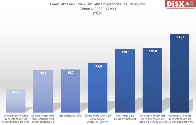 DİSK-AR da yayınladığı raporda, verilerin gerçeği yansıtmadığını iddia ederek TÜİK’in ham verilerinden yola çıkarak emekli, dar ve düşük gelirlilerin hissettiği enflasyonu hesapladı. Gıda enflasyonunun ortalama yüzde 94,7, emeklilerin gıda enflasyonunun yüzde 120,6, orta sınıfın yüzde 102,8, düşük gelirlinin yüzde 122 ve en yoksul yüzde 20’lik kesimin gıda enflasyonunun yüzde 139,7 olduğunu belirtti. En yoksul kesim ile en yüksek gelir grubu gıda enflasyonu farkının yaklaşık 70 puan olduğuna değinilen raporda, hükümetin 2002 yılında iktidara geldiğinde enflasyonun yüzde 29,7 olduğu, 20 yılda 50 puan artış görüldüğü de belirtildi.