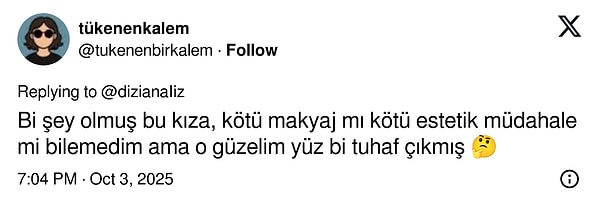 Yapılan makyajın yoğunluğundan mıdır yoksa estetik işlemlerden mi bilinmez ama yüz hatları bir hayli keskinleşen ismin son haline X kullanıcılarından yorumlar gecikmedi.