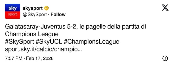Galatasaray'ın Şampiyonlar Ligi play off turunda İtalyan devi Juventus karşısında aldığı 5-2'lik galibiyet Avrupa'da da günün en çok öne çıkan spor olayı oldu. Rams Park'ta oynanan karşılaşma Avrupa basını ve sosyal medyanın büyük takipçi sayılarına sahip ünlü hesapları tarafından da görüldü. Peki basın sarı kırmızıların Şampiyonlar Ligi galibiyeti hakkında neler dedi?
