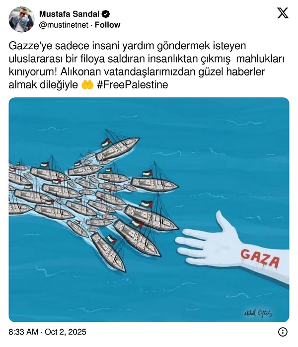İnsani yardım ulaştırmak amacıyla Gazze’ye doğru yol alan Küresel Sumud Filosu bir önceki gün saldırıya uğradı. İsrail komandoları gemilere çıkarak aktivistleri gözaltına aldı. Sosyal medyada ise tepkiler çığ gibi büyüdü. Aralarında Mustafa Sandal, Sıla Türkoğlu, Gülben Ergen ve Murat Yıldırım’ın da bulunduğu çok sayıda ünlü isim Filistin’e destek mesajları paylaştı.