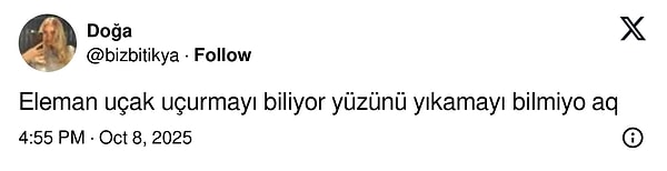 Videonun başında otelde güne hazırlanışını paylaşan pilot, ardından servis aracına binerek havaalanına geçti ve uçak öncesi kontrol aşamalarını gösterdi. Ancak sosyal medya kullanıcıları videoda bambaşka bir detaya takıldı. O da genç pilotun yüz yıklama şekli. 🥲