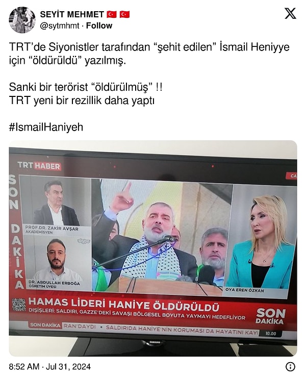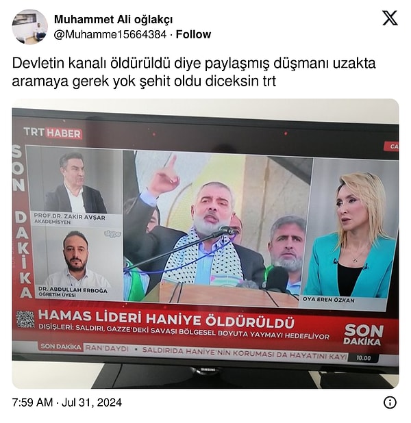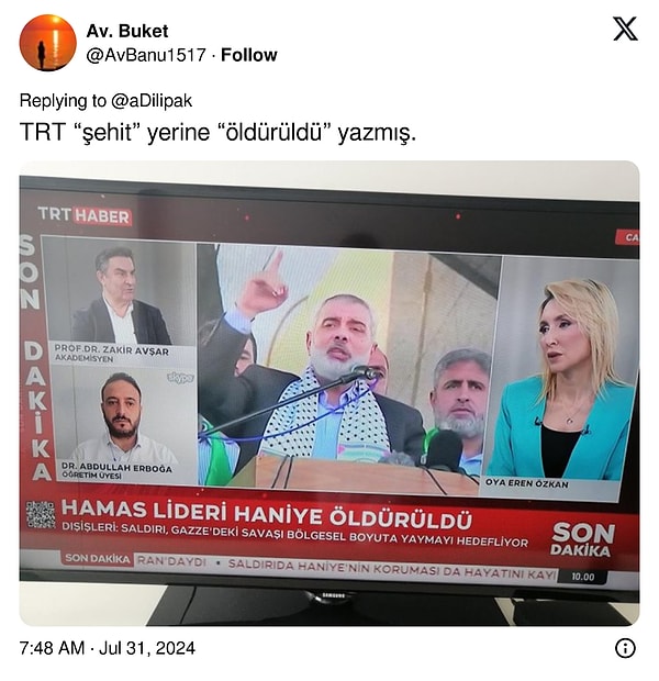TRT'nin Hamas Lideri İsmail Haniye'nin suikastini 'öldürüldü' diye vermesi sonrası iktidara yakın hesaplar sosyal medyadan linç girişimine başladı.