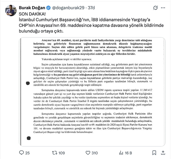 İstanbul Büyükşehir Belediyesi ile Belediye Başkanlığı görevinden uzaklaştırılarak tutuklanan Ekrem İmamoğlu’na yönelik yürütülen yolsuzluk soruşturması kapsamında hazırlanan iddianamede, İstanbul Cumhuriyet Başsavcılığı’nın, Yargıtay’a CHP’nin Anayasa’nın 69. maddesince kapatma davasına yönelik bildirimde bulunduğu iddia edildi ancak iddia Başsavcılık tarafından yalanlandı.