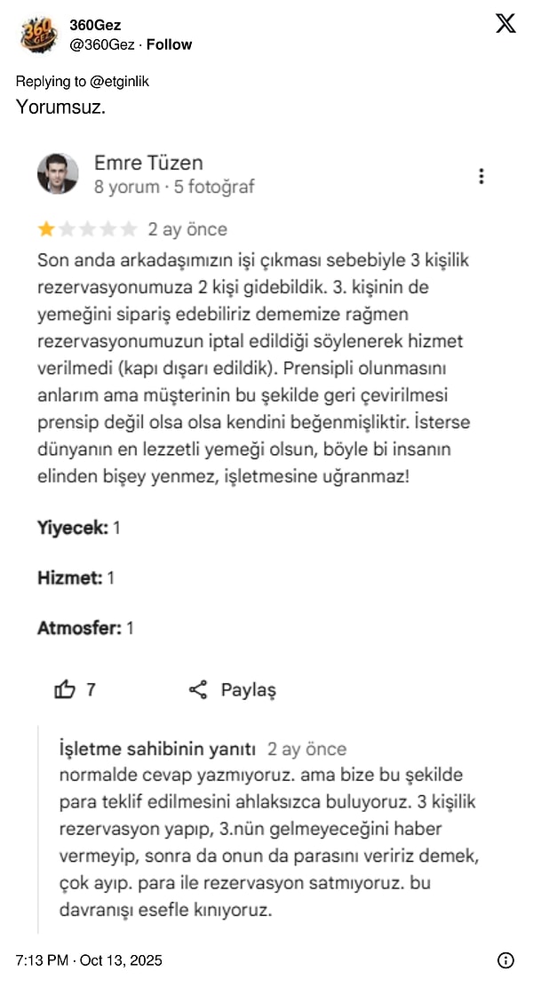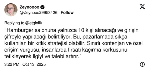 İstanbul Emirgan'daki bir hamburgercinin çalışma şekli ve sosyal medya hesabınan duyurduğu fiyatları gündem oldu. Günde sadece 10 müşteri aldığını belirten işletme, 3 arkadaş gidecekken birinizin işi çıkarsa siz onun parasını vermek isteseniz bile rezervasyonunuzu iptal ediyor. Mekana girebilen günlük 10 kişiden biri olabilmeniz için günler öncesinden rezervasyon yaptırmanız gerekiyor ve dükkandan içeri girerken de size verilen özel şifre ile kapıyı açmalısınız.