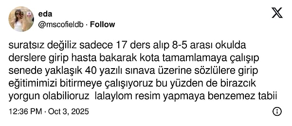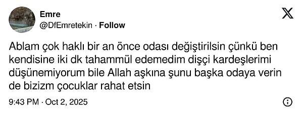 Sivas'ta bir KYK Yurdu'nda Diş Hekimliği öğrencileriyle aynı odada kalan Güzel Sanatlar öğrencisi, yaşadığı duruma isyan etti. Kendisinin çok neşeli olduğunu söyleyen öğrenci, diğer 3 öğrencinin çok ciddi olduğunu anlattı. Öğrencisinin anlattıkları sosyal medyada bir tartışmanın fitilini ateşledi.