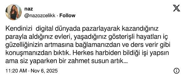 O paylaşımın altına 'Allah’ıma şükürler olsun, bana böyle bir evde oturmayı nasip ettiği için. İç güzelliğiniz arttıkça dışarıda da daha çok güzelliklere şahitlik ettirileceksiniz. Her geçen gün ruhumuzu, kalbimizi, zihnimizi kötülükten, nefretten, yargıdan, öfkeden, kıskançlıktan arındırmaya çalışmamız gerekiyor.' ifadelerini düşen isim tepki çekti.