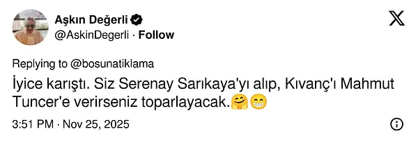 Hayrettin'in kendisine 'Hayatın bir film olsa kimin oynamasını isterdin?' diye sorması üzerine bir düşünen, düşündükten sonra da 'Bir kaya vardı, Sarıkaya mı?' cevabını verdi. Bahsettiği kişinin Serenay Sarıkaya olduğunu anlayan Hayrettin ve izleyici gülmeye başladığındaysa sinirlendi; 'Niye? Oynayamaz mı canım? Ne bakıyorsunuz öyle? Oynayabilir. Onda rol kabiliyeti var. Bir ufak makyajdır, şudur budur, olur' açıklamasında bulundu.