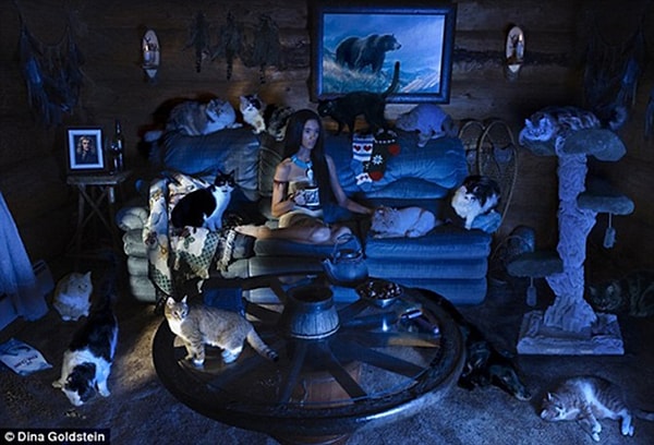Pocahontas'ın çevresini kediler çevirmiş. Karanlık bir odada televizyon seyrediyor.