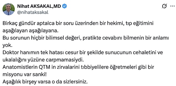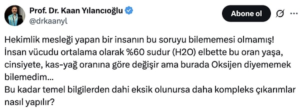 Kim Milyoner Olmak İster'de bir doktora sorulan 'İnsan vücudunda kütlece en fazla bulunan element hangisidir?' sorusu günlerdir tartışılıyor. Doktor olan yarışmacının soruyu bilememesi sosyal medyanın gündemine oturmuş durumda. Ancak başta meslektaşları olmak üzere pek çok kişi yarışmacıya desteklerini açıkladılar.