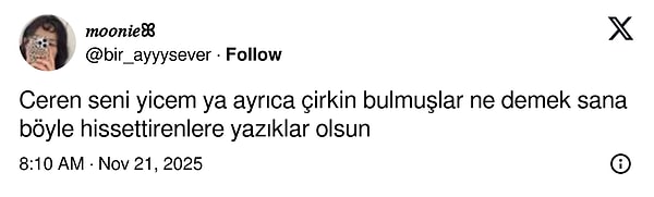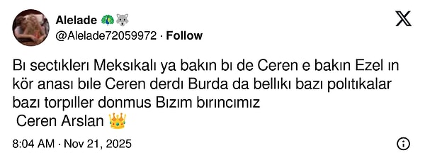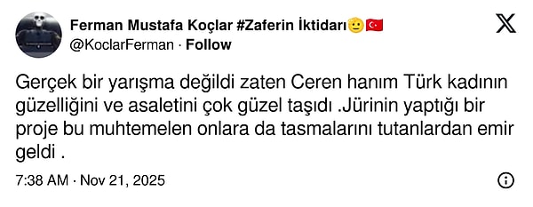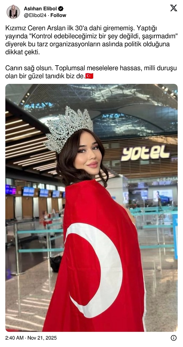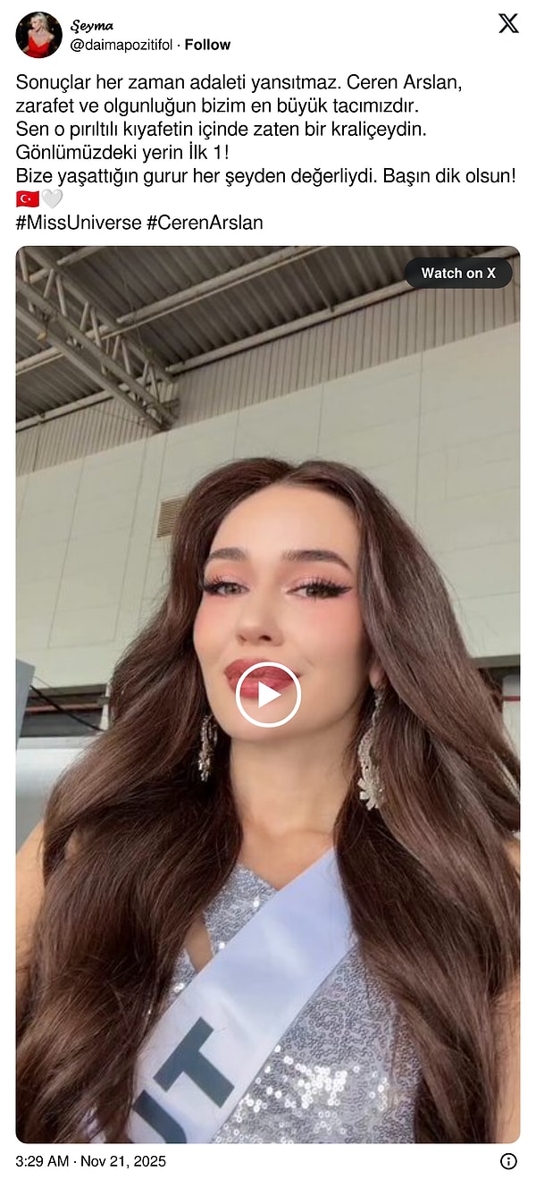 Miss Universe 2025 yarışmasının sonuçları açıklanır açıklanmaz sosyal medya adeta alev aldı. Meksika güzeli Fatima Bosch’un birincilik tacını takmasının ardından gözler Türkiye’yi temsil eden Ceren Arslan’a çevrildi. Ancak Arslan’ın yarışmada ilk 30’a dahi sokulmaması, herkesi şaşkına çevirdi. Sosyal medya hesabından açıklama yapan ve duygularını dile getiren temsilcimize destek mesajları yağdı.