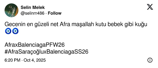 Defileleri izlerken ön sıralarda yer alan oyuncu, dünyaca ünlü modellerle ve moda ikonlarıyla aynı karelerde yer almıştı. Katıldığı etkinlik sonrası paylaştığı fotoğraflar dakikalar içinde yorum yağmuruna tutulmuştu.
