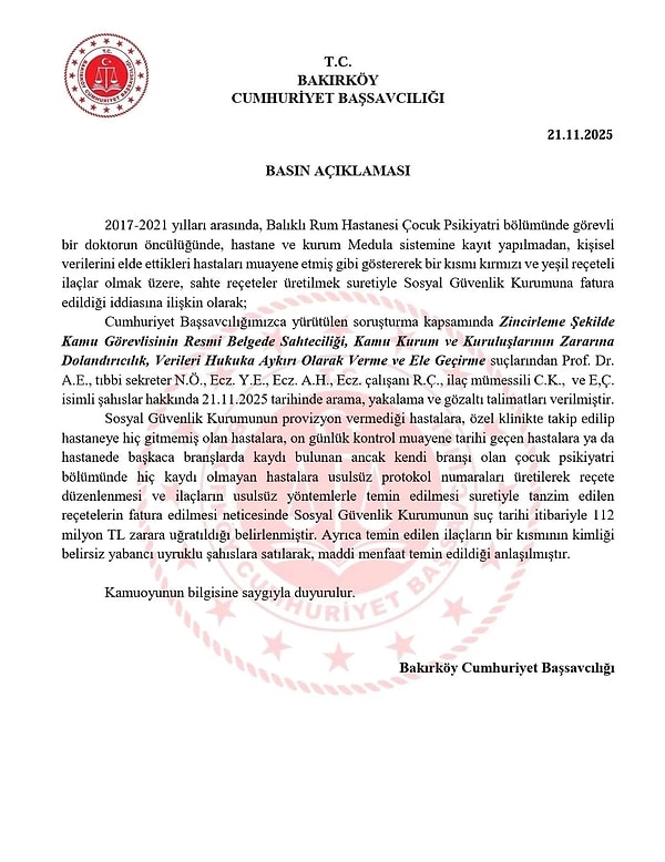 'Cumhuriyet Başsavcılığımızca yürütülen soruşturma kapsamında Zincirleme Şekilde Kamu Görevlisinin Resmi Belgede Sahteciliği, Kamu Kurum ve Kuruluşlarının Zararına Dolandırıcılık, Verileri Hukuka Aykırı Olarak Verme ve Ele Geçirme suçlarından Prof. Dr. A.E., tıbbi sekreter N.O., Ecz. Y.E., Ecz. A.H., Ecz. çalışanı R.Ç., ilaç mümessili C.K. ve E.Ç. isimli şahıslar hakkında 11.05.2025 tarihinde arama, yakalama ve gözaltı kararı verilmiştir.