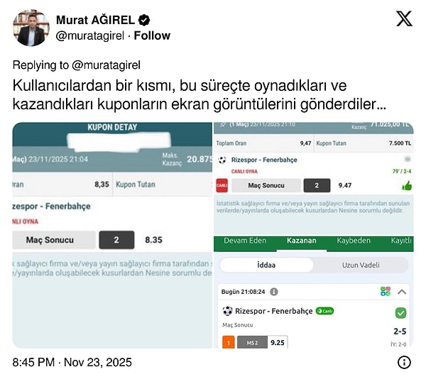 Ağırel, söz konusu karmaşanın 'Merkezi Bahis Sistemi' yönetiminin aldığı karar sonucunda gerçekleştiğini belirterek, sosyal medya hesabından yaptığı paylaşımda şu ifadeleri kullandı: