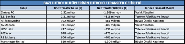Aşağıdaki tablo, son 10 yılda Avrupa’nın bazı kulüplerinin futbolcu satışından elde ettiği gelirleri ve giderler düştükten sonra kalan net gelirlerini göstermektedir. Tablodan, altyapıya önem veren kulüplerin gelir/gider dengesini daha iyi kurduğu anlaşılmaktadır. Altyapıdan futbolcu yetiştirmeyen kulüpler bütçe açığı verirken, tam tersini yapanların bütçe fazlası verdiği görülmektedir.