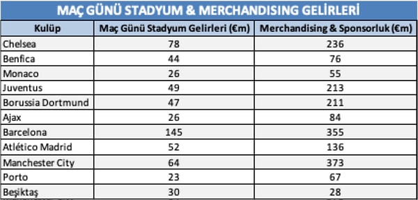 Futbolun bir diğer önemli gelir kaynağı ise maç günü stadyum gelirleri ile merchandising ve sponsorluk gelirleridir. Aşağıdaki tablo, 2022/23 sezonunda bazı kulüplerin bu kalemlerden elde ettiği gelirleri göstermektedir: