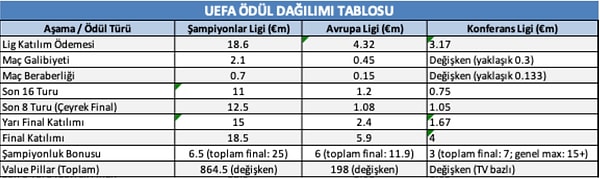 Aşağıdaki tablo, üç Avrupa Ligi’nin sabit ödül yapılarını (milyon Euro cinsinden) karşılaştırmalı olarak sunmaktadır. Veriler, UEFA’nın resmi dağılımına ve son sezon sonuçlarına göre derlenmiştir.