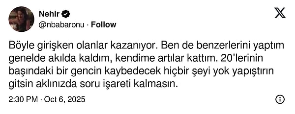 Bazı insanlar 'şans' der geçer. Bazen de her şey, sadece bir e-posta, bir DM ya da “ya ne olacak ki” diyerek atılan küçük bir adımla başlar. Bir kadın, hiçbir plan yapmadan, tamamen içgüdüsel şekilde attığı bu adımların hayatını nasıl değiştirdiğini anlattı. Hukuk okurken kitaplarını sponsor bulan, reddedildiği işe geri çağrılan, komedyenlerden ücretsiz bilet koparan ve sonunda film festivalinde en havalı işi kapan bu kadının hikayesi, “istemekten zarar gelmez” dedirtti!