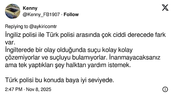 Londra'da sokakta yürürken bir şahsın hem arabaların hem de evlerin kapılarını zorladığını gören bir kadın, 'Türkiye'de asla böyle bir şey olmaz' dedi. Londra'da hem evinin hem de arabasının tamamen kilitli ve güvende olduğundan emin olmak için defalarca kontrol etmek zorunda kaldığını söyleyen kadın, Türkiye'de evin kapısını açık bıraksan da, motosikletinin anahtarını üzerinde bıraksan da kimsenin seni soymaya çalışmayacağını belirtti.