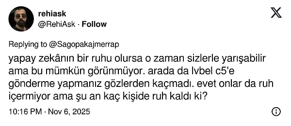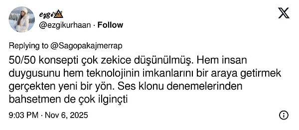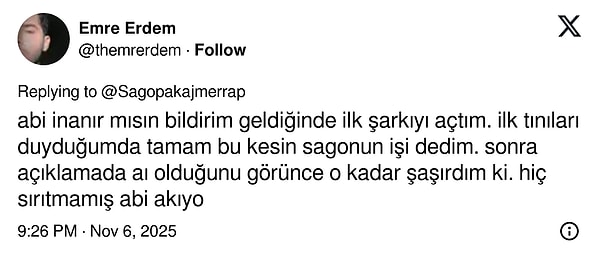 'İçinde bulunduğumuz zamanın en çok konuşulan konularından birisi şüphesiz ki yapay zeka. Müzikteki yapay zeka etkisini görüp işin derinine indikçe benim için de görüntü daha da netleşti. Müzik konusunda eksik ve cidden hacimsiz yeni prodüktörlerin şaşırtıcı ve kendilerini aşan kalitede beatler, müzikler ortaya koyması, bana 2019 senesinden beri ''bu işte bir iş var.'' dedirtiyordu.