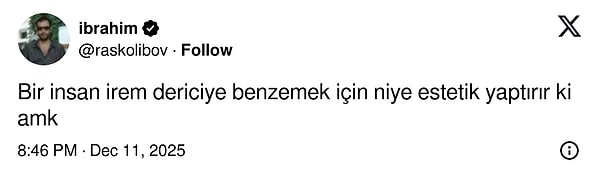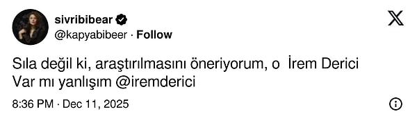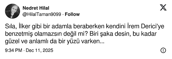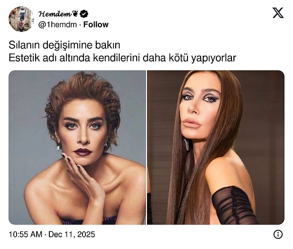 Şarkıcının son hali ise ilk bakışta X kullanıcılarına İrem Derici'yi anımsattı. Kullanıcılar Sıla’nın makyaj tarzı, yüz hatlarındaki değişim ve dudak dolgunluğunu İrem Derici'ye benzetti.